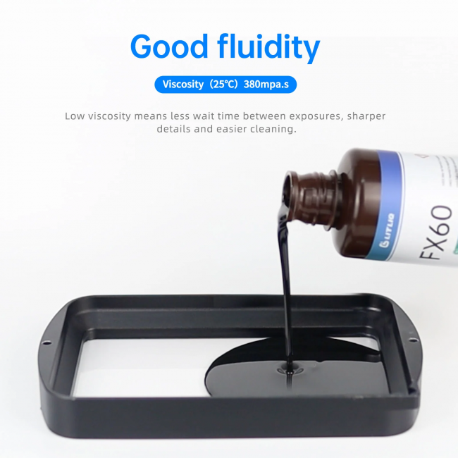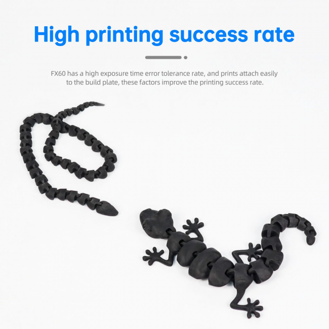 FX60 garantisce una grande affidabilità di stampa, grazie alla bassa concentrazione di pigmento e all’eccellente adesione al piano di stampa. La tolleranza agli errori di esposizione assicura risultati costanti anche con modelli complessi.